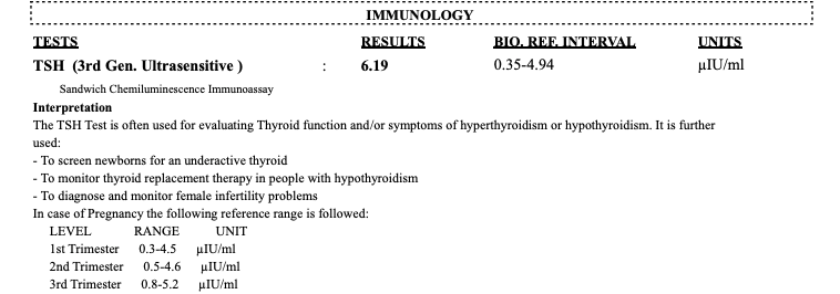 Labs reported TSH to be 6.19 U/ml. T3 to be 0.1 and T4 to be 0.3